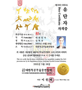 참된 무도인이 될 수 있도록 공정하고 엄격하게 심사를 실시하며, 특공무술 4단 취득시 정사범 자격 응시가 가능하다.